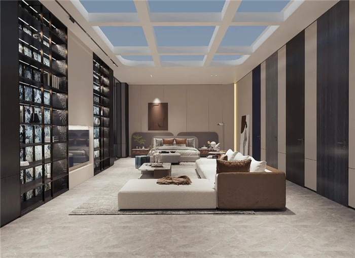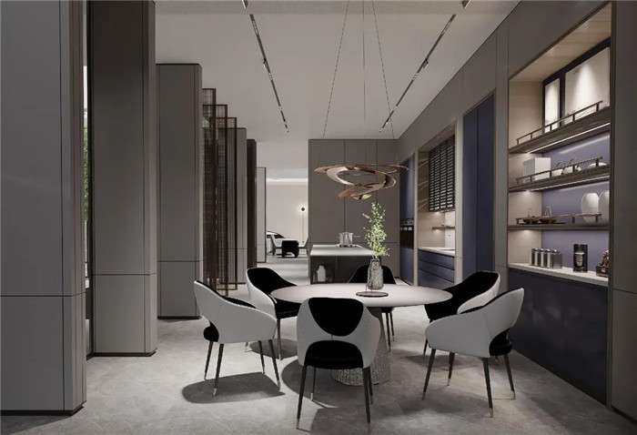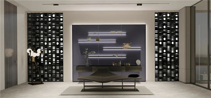 產(chǎn)品囊括了客廳、臥室、餐廳、衣帽間、書房等空間,讓家不僅僅是居住地,更是享受生活的地方??蛷d采用了一柜到頂?shù)娜X框架電視柜,背面搭配云石燈背景,簡約而不簡單;衣帽間采用時尚科技的電動平移巴士門,于細節(jié)之處彰顯魅力;餐廚空間墻面墻板整包,給人舒適溫馨之感;簡約式懸挑書柜設(shè)計搭配烤漆工藝超薄帶燈層板,氛圍感十足。