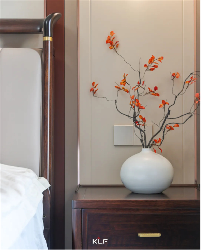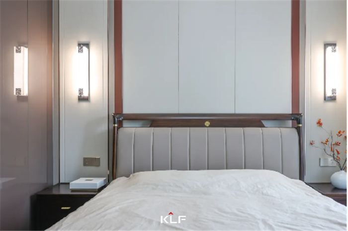 新中式床頭背景墻,勾勒出一個寧靜悠遠的意境,搭配色調(diào)淡雅的復(fù)古燈具,方寸之間皆是風(fēng)雅韻味。
