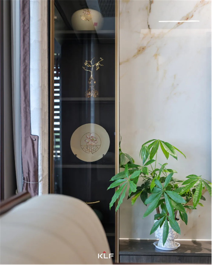 云飛馬鳴,開花落葉,事事相關(guān),物物相連。整個客廳以深色為主調(diào),空間局部小品和綠植講究節(jié)奏感與韻律美,與整體風(fēng)格形成類比,凸顯空間的層次感與秩序性。