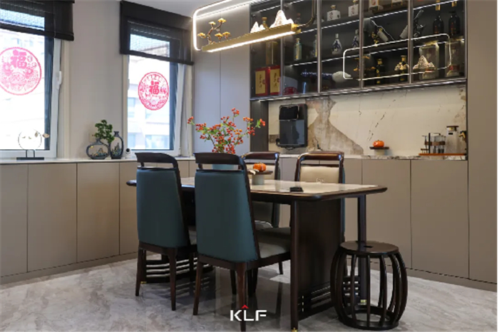開放式餐廳設(shè)計,大氣餐邊柜玻璃柜門與開放格,超強的儲物空間加上燈帶的加持,頗有意境和空間感。