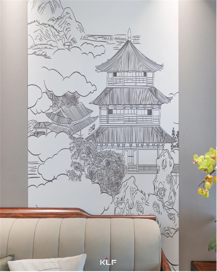 墻壁若隱若現(xiàn)的山水畫與客廳搭配,素淡的筆調(diào)盡顯山清水秀之美,素雅的色調(diào)與山水結(jié)合,勾畫出我們心目中難忘的景色。
